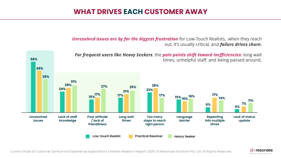 - Overall Takeaway: The common pain point across all three groups is that unresolved issues are the single greatest trigger for dissatisfaction and leaving a brand. Winning brands will be those that tailor their service to meet the specific needs of each profile, whether that customer contacts them once a year or once a week.
